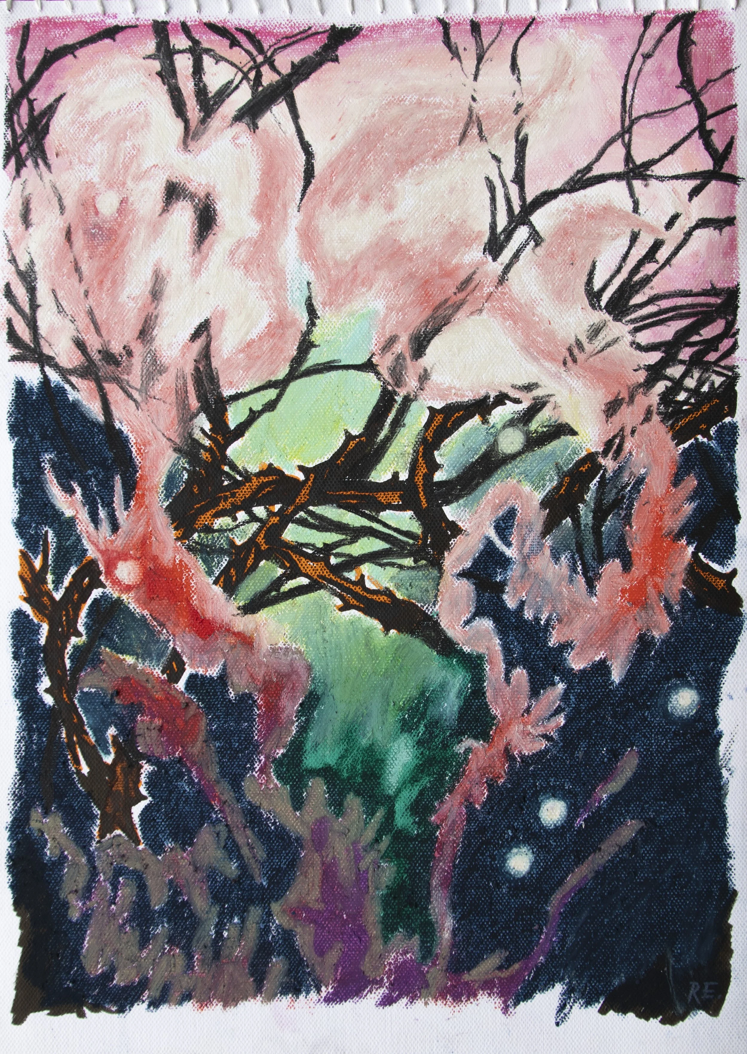 Technique / Materials: Oil pastels, watercolour pen, colour pencil on canvas